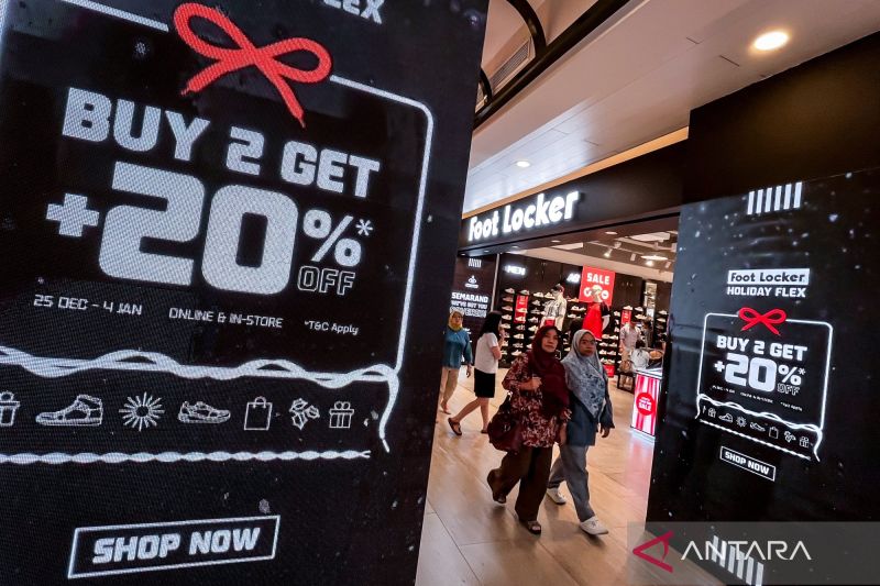 Foto yang diambil pada Minggu (28/12/2025) menunjukkan pengunjung melintasi papan informasi diskon di DP Mall Semarang, Jawa Tengah. Tampilan materi promosi tersebut menjadi bagian dari komunikasi publik mengenai inisiatif yang bertujuan meningkatkan aktivitas belanja konsumen.