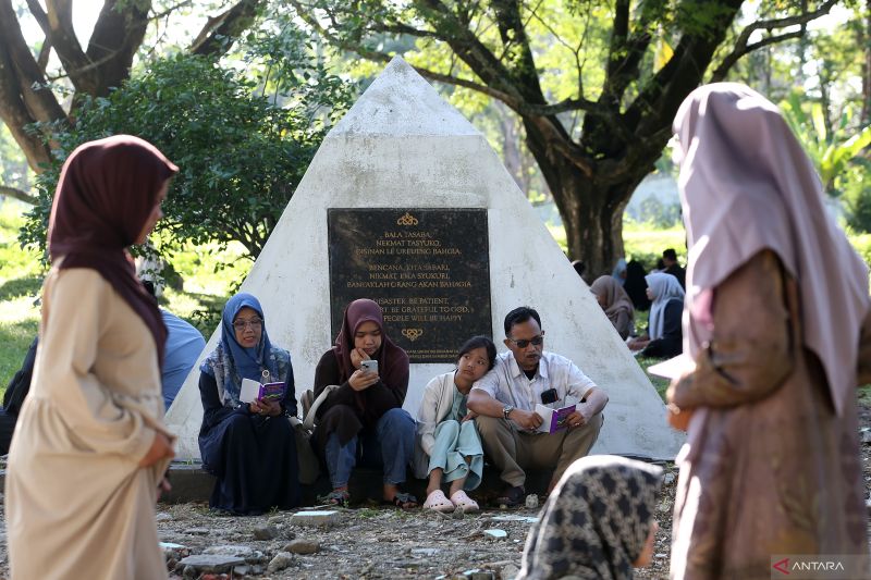 Suasana khidmat terlihat saat warga berkumpul di area pemakaman massal. Mereka tampak melafalkan doa bersama dan hening sejenak mengenang korban. Beberapa keluarga datang untuk mengunjungi tugu pemakaman atau petak makam yang menyimpan memori kolektif dari tragedi tersebut.